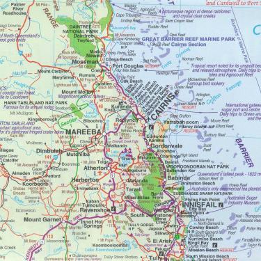 On the reverse there are two enlargements: the area around Mackays with the Whitsunday Islands and the coastline of the Tropical North Queensland with the Atherton Tableland, plus plans showing main streets in Cairns, Mt Isa, Mackay and Townsville. The map also contains numerous travel tips and contact addresses, lists of facilities in popular national parks, wildlife areas, state forests and dam recreational areas, and a diagram of the 4WD track/developmental road from Lakeland across the interior of the peninsula to Cape York.