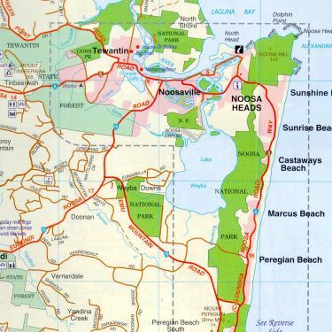 On the reverse are indexed street maps at 1:29,000 of the main Sunshine Coast resorts providing continuous coverage of the coast from Noosa National Park, Noosaville and Tewantin in the north to Pelican Waters in the south. Additional insets show street maps of Nambour and the resorts of southern Bribie Island. Brief notes describe the region's attractions and tables summarize the facilities at the National Parks and State Forest Recreation Areas.