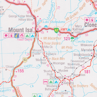 Detailkaart van een deel van Australië. Zeer goed leesbaar, met naast de topografische details veel symbolen waarmee allerhande toeristische zaken worden aangeduid als campsites, nationale parken, attracties, wandelmogelijkheden etc.