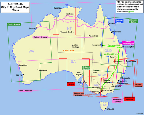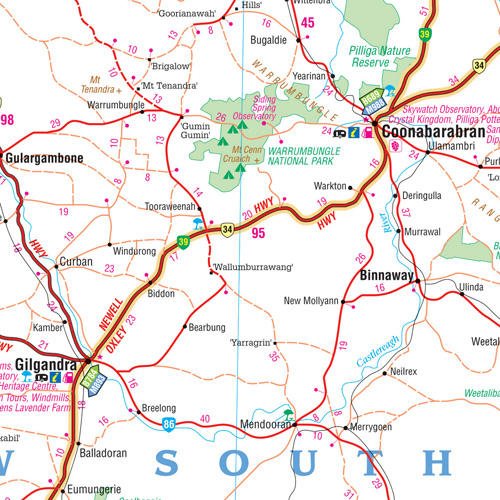 Detailkaart van een deel van Australië. Zeer goed leesbaar, met naast de topografische details veel symbolen waarmee allerhande toeristische zaken worden aangeduid als campsites, nationale parken, attracties, wandelmogelijkheden etc.