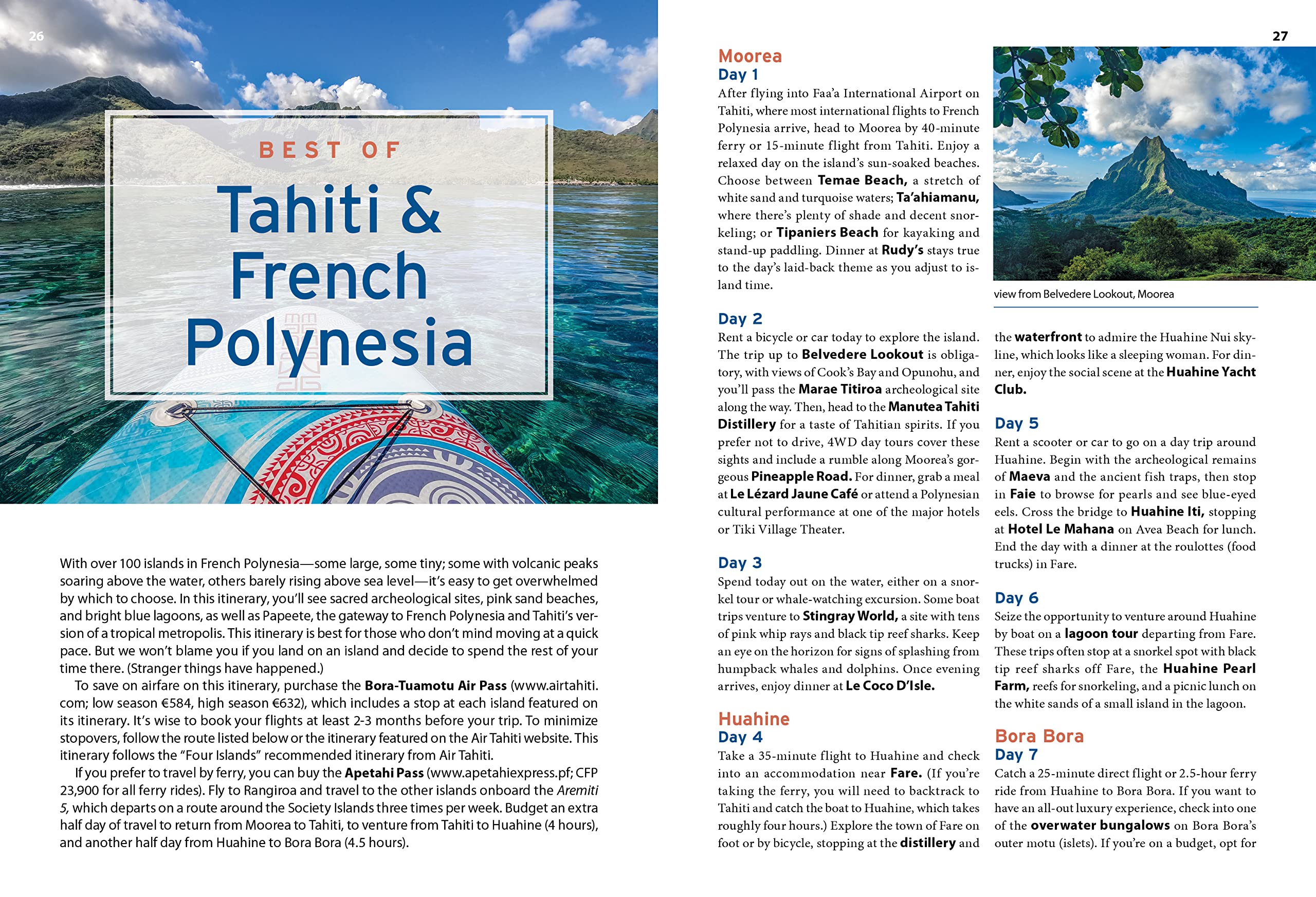· Must-see highlights and unique experiences: Dance to the beat of Tahitian drums at a Polynesian cultural festival, admire striking views of Moorea's volcanic landscape from Belvedere Lookout, and fall asleep under the stars from the comfort of your overwater bungalow in Bora Bora. Venture out to the Marquesas Islands for dramatic landscapes, secluded beaches, and the best handicrafts in the region, visit ancient tikis, and feast on delicious fresh seafood and tropical fruit