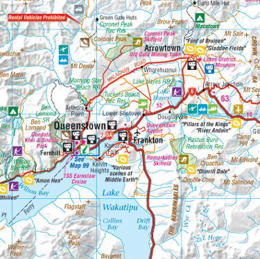 Travelling time/distance tables for main routes on each island are provided, also an introductory section on recommended attractions and activities. The information on a selection of national parks provides a brief introduction to their attractions; the maps do not present any extra detail, but show a convenient overview of each park on one page. A collection of 48 city centre and suburb maps for towns and cities follow the main road atlas pages. The street maps show one-way streets, notable buildings, places of interest and useful facilities e.g. post offices, accommodation, shopping areas and hospitals. The less detailed suburban maps show the main communications and name many roads and districts.