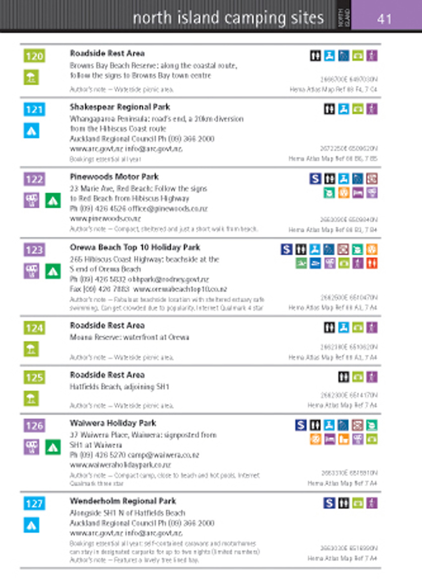 The New Zealand Motorhome & Camping Atlas features more than 1200 places in New Zealand where you can pitch a tent or pull up your motorhome. To make it easy to find the sites you are interested in, all of the sites are shown on the road atlas which is now included in the back section of the book. Simply view the maps for the areas that you wish to travel, find the relevant numbers for the areas that interest you then locate the number in the listing of motorhome parks, campsites and rest areas for all the information about the site you have chosen. Each entry gives details of the site's facilities, as well as useful information, like who to contact for bookings, GPS coordinates and author recommendations.