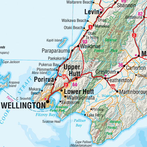 A super-sized New Zealand wall map with over 2,000 place names, this is New Zealand's most comprehensive wall map. Ideal for an office, boardroom, dispatch area or classroom. New Zealand's largest wall map. It is fully indexed with hill shading and a decorative Maori border. Rolled in a tube.