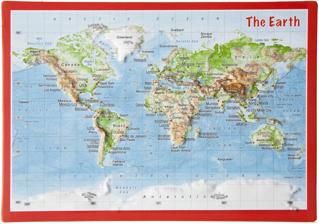De wereldkaart met reliëf is echt heel mooi! Mooi cadeautje voor iemand die een wereldreis gaat maken. Ik doe er kleine stickertjes bij zodat ze aan het einde van haar reis een kaart heeft met hopelijk een boel stipjes!