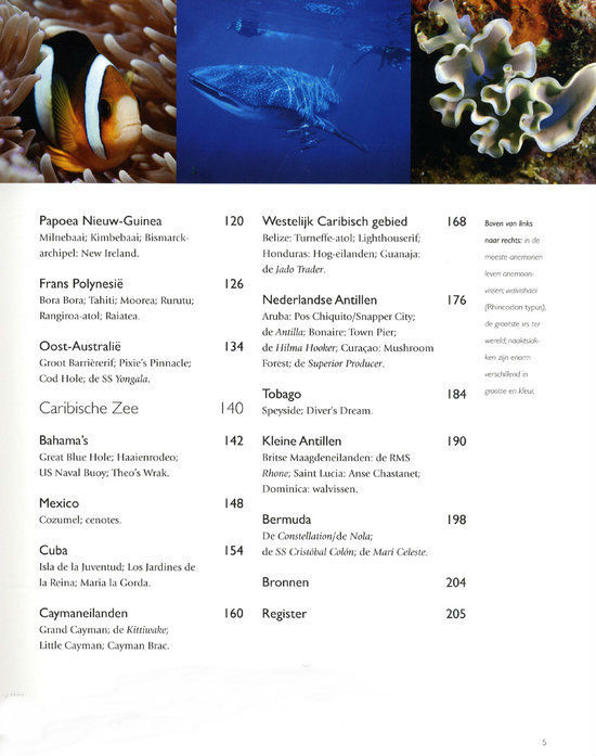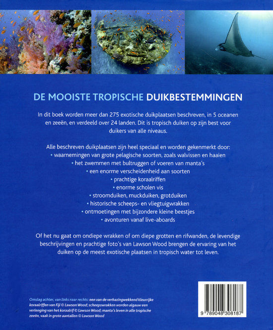 Wel 275 duikplaatsen worden beschreven in deze uitgave, allemaal tropische duikbestemmingen, in 24 landen. Het is bedoeld voor duikers van verschillende niveaus. Zowel beginners als gevorderden kunnen op de beschreven plekken terecht. Wrakken, grotten en koraalrifwanden worden beschreven en de prachtige kleurrijke foto's maken het een fraaie uitgave. De beschrijvingen van de plaatsen zijn soms wat kort, maar altijd ter zake doende. Met uitgebreid register, bronvermelding en vele websites van organisaties, tijdschriften, en websites over duiken en onderwaterfotografie. Ook met kaarten van de verschillende werelddelen om de duikplaatsen aan te geven. De auteur duikt al sinds 1965 en heeft meer dan 15.000 duiken gedaan. Hij heeft 45 boeken op zijn naam en is een bekende in de wereld van de onderwaterfotografie.