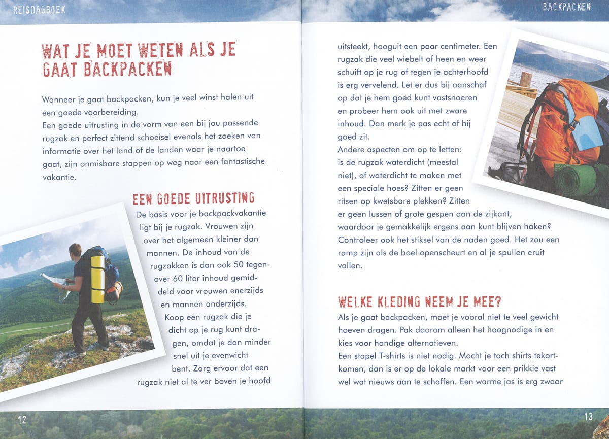 Het Backpacken reisdagboek mag niet ontbreken bij iedereen die van plan is een dergelijke reis te maken. Dit boek bevat praktische informatie voor de backpacker: over EHBO en specifi eke gevaren van het reizen als backpacker. Daarnaast is het reisdagboek voorzien van handige overzichten met woordenlijst in vier talen, telefoonnummers, radiofrequenties en een tijdtabel. Uiteraard heeft de reiziger ook meer dan voldoende ruimte om verslag te doen van zijn of haar ervaingen. Een mooi en praktisch cadeau!