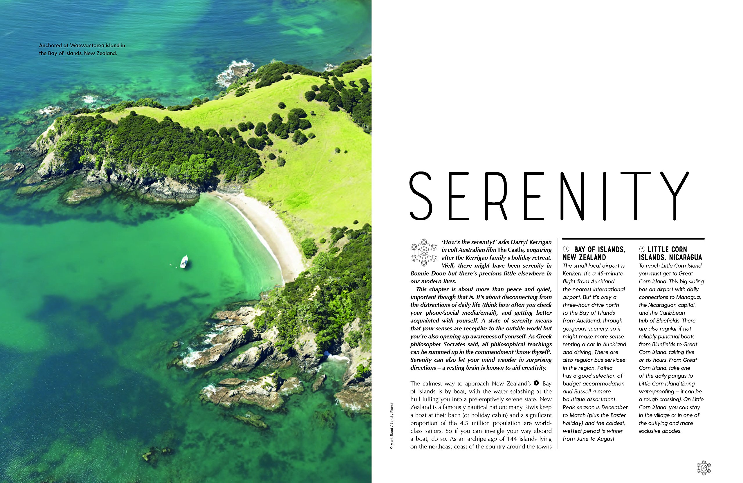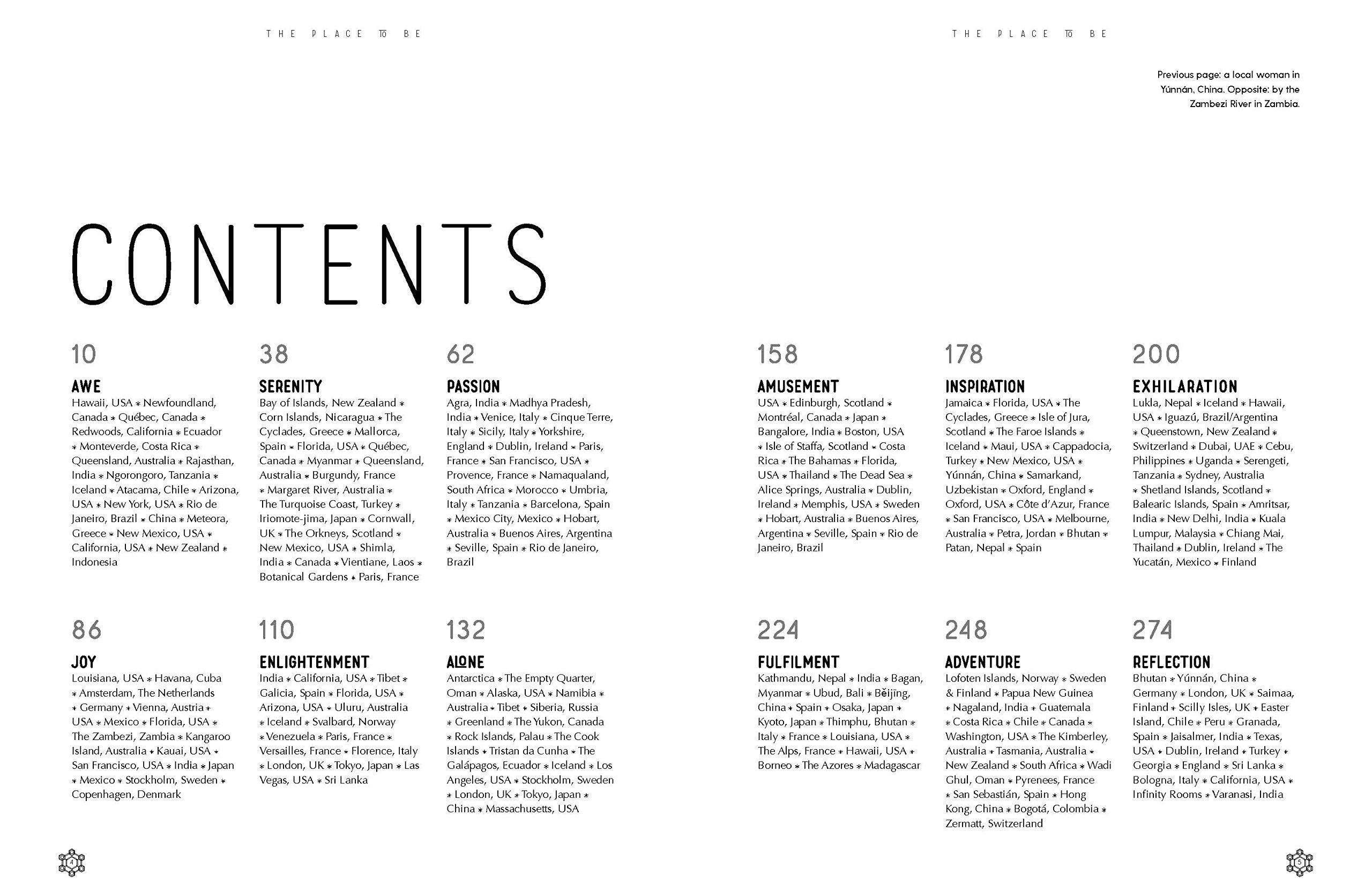 With 20 places and experiences for each emotion and state of mind, The Place to Be features 240 travel destinations around the world. Stand in awe and marvel at enormous natural phenomena; give yourself a joyful boost with cat cafes and chocolate indulgences; seek serenity on beautiful remote islands; find calm oases in the heart of bustling cities; and join the path to enlightenment with Renaissance paintings and religious pilgrimages.