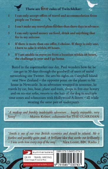 There were five rules of Twitchhiker: I can only accept offers of travel and accommodation from people on Twitter; I can't make any travel plans further than three days in advance; I can only spend money on food, drink and anything that might fit in my suitcase; If there is more than one offer, I choose which I take. If there is only one, I have to take it within 48 hours; and If I am unable to find a way to move on from a location within 48 hours, the challenge is over and I go home. Bored in the bread aisle of the supermarket one day, Paul Smith wondered how far he could get around the world in 30 days through the goodwill of users of social networking site Twitter.