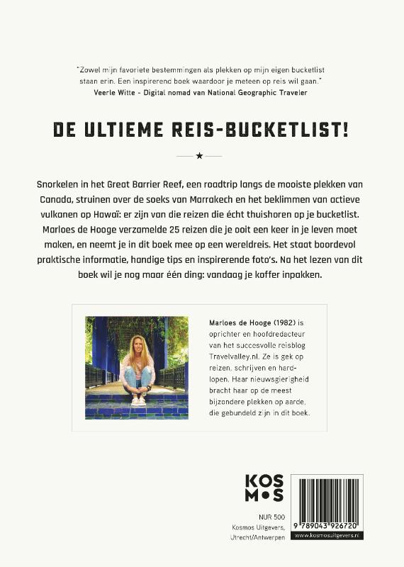 Marloes de Hooge, hoofdredacteur van de succesvolle reisblog Travelvalley, verzamelde voor dit boek de reizen die op je bucketlist thuishoren. Van snorkelen in het Great Barrier Reef - Australië, een roadtrip langs de mooiste plekken van Canada, struinen over de soeks van Marrakech tot het beklimmen van actieve vulkanen op Hawaï. Boordevol praktische informatie, handige tips en inspirerende foto's. Na het lezen van dit boek wil je nog maar één ding: vandaag je koffer inpakken!
