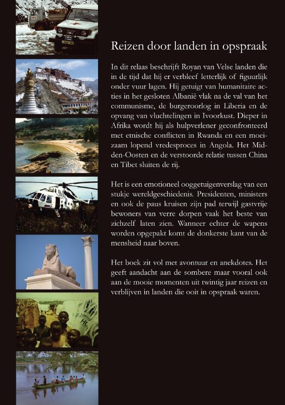 In dit relaas beschrijft Royan van Velse landen die in de tijd dat hij er verbleef letterlijk of figuurlijk onder vuur lagen. Hij getuigt van humanitaire acties in het gesloten Albanië vlak na de val van het communisme, de burgeroorlog in Liberia en de opvang van vluchtelingen in Ivoorkust. Dieper in Afrika wordt hij als hulpverlener geconfronteerd met etnische conflicten in Rwanda en een moeizaam lopend vredesproces in Angola. Het Midden-Oosten en de verstoorde relatie tussen China en Tibet sluiten de rij.