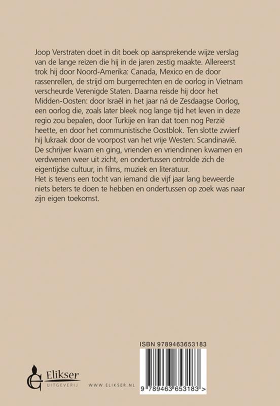 Joop Verstraten doet in dit boek op aansprekende wijze verslag van de lange reizen die hij in de jaren zestig maakte. Allereerst trok hij door Noord-Amerika: Canada, Mexico en de door rassenrellen, de strijd om burgerrechten en de oorlog in Vietnam verscheurde Verenigde Staten. Daarna reisde hij door het Midden-Oosten: door Israël in het jaar ná de Zesdaagse Oorlog, een oorlog die, zoals later bleek nog lange tijd het leven in deze regio zou bepalen, door Turkije en Iran dat toen nog Perzië heette, en door het communistische Oostblok. Ten slotte zwierf hij lukraak door de voorpost van het vrije Westen: Scandinavië. De schrijver kwam en ging, vrienden en vriendinnen kwamen en verdwenen weer uit zicht, en ondertussen ontrolde zich de eigentijdse cultuur, in films, muziek en literatuur. Het is tevens een tocht van iemand die vijf jaar lang beweerde niets beters te doen te hebben en ondertussen op zoek was naar zijn eigen toekomst.