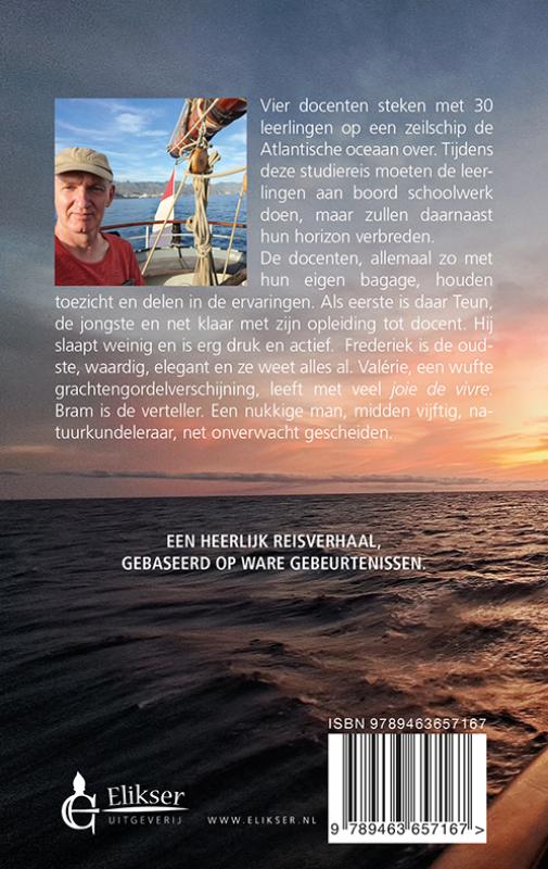 Vier docenten steken met 30 leerlingen op een zeilschip de Atlantische oceaan over. Tijdens deze studiereis moeten de leerlingen aan boord schoolwerk doen, maar zullen daarnaast hun horizon verbreden. De docenten, allemaal zo met hun eigen bagage, houden toezicht en delen in de ervaringen. Als eerste is daar Teun, de jongste en net klaar met zijn opleiding tot docent. Hij slaapt weinig en is erg druk en actief. Frederiek is de oudste, waardig, elegant en ze weet alles al. Valérie, een wufte grachtengordelverschijning, leeft met veel joie de vivre. Bram is de verteller. Een nukkige man, midden vijftig, natuurkundeleraar, net onverwacht gescheiden. Een heerlijk reisverhaal, gebaseerd op ware gebeurtenissen.Reviews