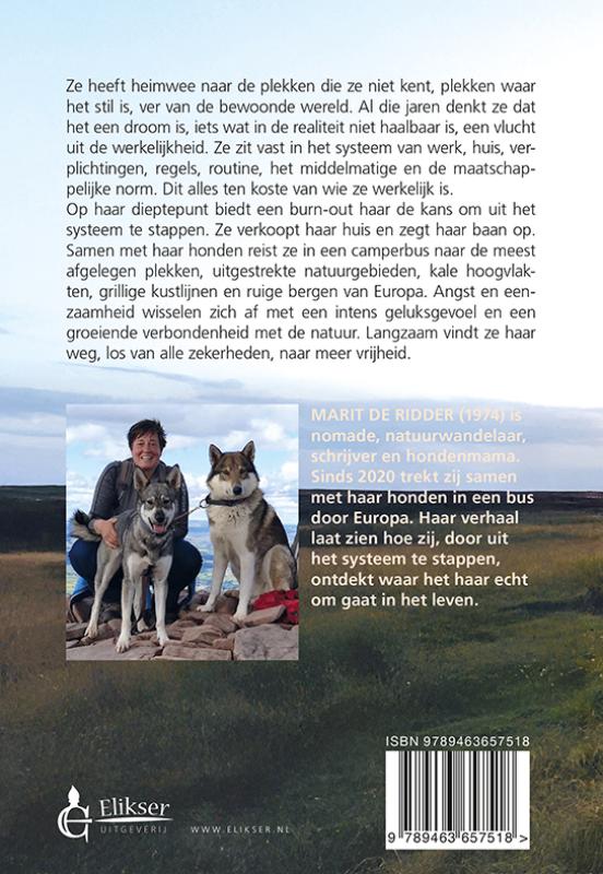 Ze heeft heimwee naar de plekken die ze niet kent, plekken waar het stil is, ver van de bewoonde wereld. Al die jaren denkt ze dat het een droom is, iets wat in de realiteit niet haalbaar is, een vlucht uit de werkelijkheid. Ze zit vast in het systeem van werk, huis, verplichtingen, regels, routine, het middelmatige en de maatschappelijke norm. Dit alles ten koste van wie ze werkelijk is. Op haar dieptepunt biedt een burn-out haar de kans om uit het systeem te stappen. Ze verkoopt haar huis en zegt haar baan op. Samen met haar honden reist ze in een camperbus naar de meest afgelegen plekken, uitgestrekte natuurgebieden, kale hoogvlakten, grillige kustlijnen en ruige bergen van Europa. Angst en eenzaamheid wisselen zich af met een intens geluksgevoel en een groeiende verbondenheid met de natuur. Langzaam vindt ze haar weg, los van alle zekerheden, naar meer vrijheid. MARIT DE RIDDER (1974) is nomade, natuurwandelaar, schrijver en hondenmama. Sinds 2020 trekt zij samen met haar honden in een bus door Europa. Haar verhaal laat zien hoe zij, door uit het systeem te stappen, ontdekt waar het haar echt om gaat in het leven.