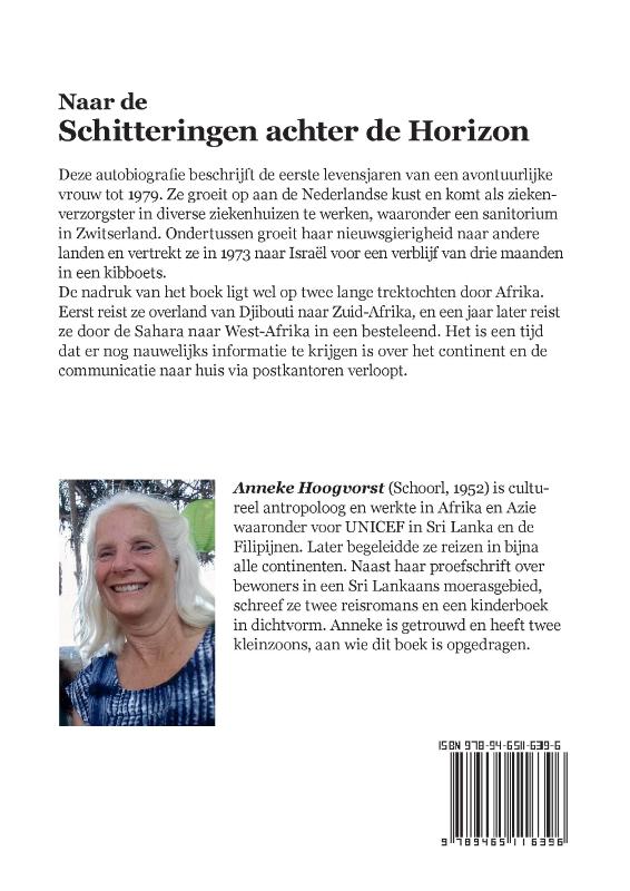 Naar de Schitteringen achter de Horizon Deze autobiografie beschrijft de eerste levensjaren van een avontuurlijke vrouw tot 1979. Ze groeit op aan de Nederlandse kust en komt als ziekenverzorgster in diverse ziekenhuizen te werken waaronder een sanatorium in Zwitserland. Ondertussen groeit haar nieuwsgierigheid naar andere landen en vertrekt ze in 1973 naar Israël voor een verblijf van drie maanden in een kibboets. De nadruk van het boek ligt wel op twee lange trektochten door Afrika. Eerst reist ze overland van Djibouti naar Zuid-Afrika, en een jaar later gaat ze met een besteleend door de Sahara naar West-Afrika. Het is een tijd dat er nog nauwelijks informatie te krijgen is over het continent en de communicatie naar huis via postkantoren verloopt.Reviews