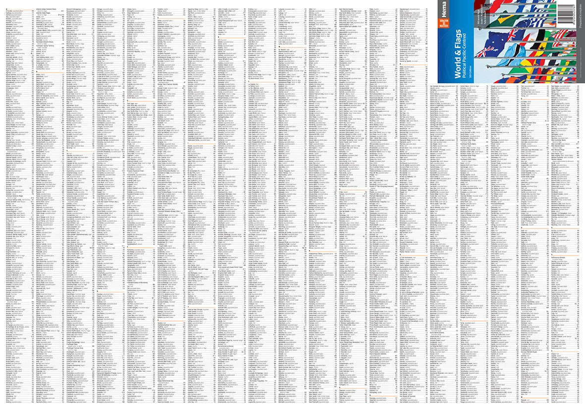 A world political map that has 195 named flags of the world bordering it. The mapping has relief shading to accurately depict each country's topography, while an International Date Line highlights world time zones. Also included is an index for reference, making Hema's World & Flags map perfect as either an educational tool, a reference point or for decoration.Reviews