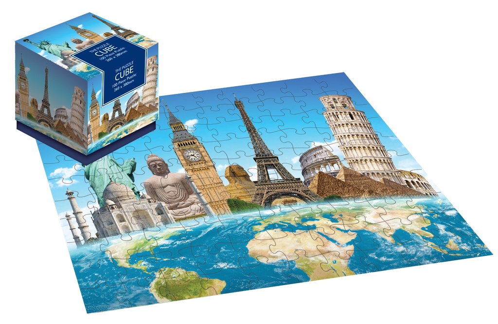 De grote Weredlwonderen en monumenten: deze leuke en educatieve puzzel van 100 stukjes. Verpakt in een handige kubus die je overal mee naar toe kunt nemen!