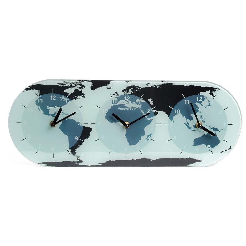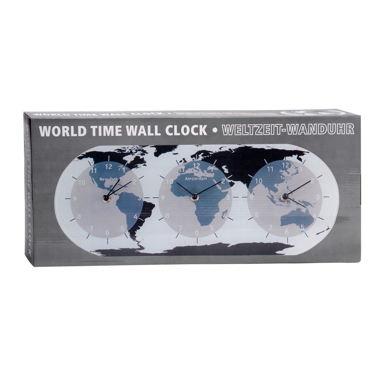 Glazen wandklok met daarop drie verschillende tijden aangegeven in New York, Amsterdam en Tokyo. Leuk voor thuis of op kantoor!