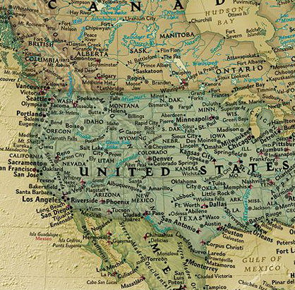 During the 1930s and 1940s, National Geographic designed several world maps using a projection that separated the eastern and western hemispheres. We have brought back this classic view of the world with modern cartography and elegant earth tones for a fashionably retro view of the world.