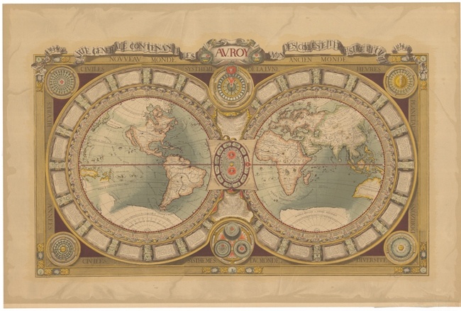 De kaart toont de wereld in twee hemisferen, omringd door allegorische figuren die de sterrenbeelden en definities van geografische termen (meridianen, parallellen, polen, keerkringen, de evenaar, enz.) voorstellen. De hoeken en het midden zijn versierd met verschillende artistieke voorstellingen van het zonnestelsel, de fasen van de maan, enz.