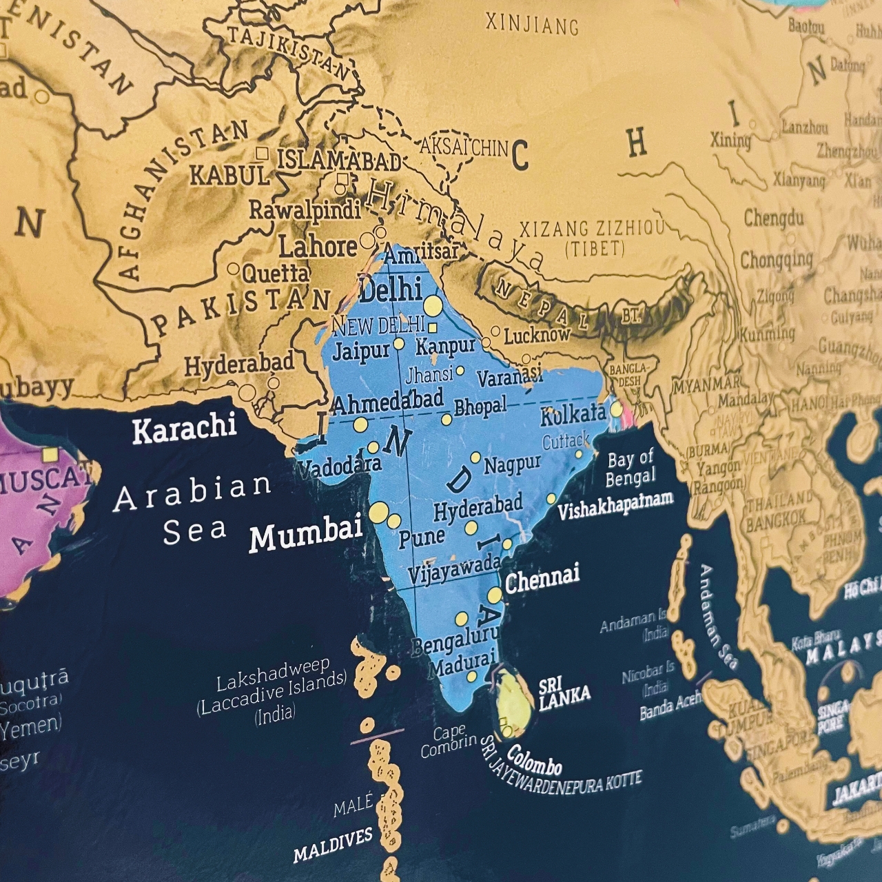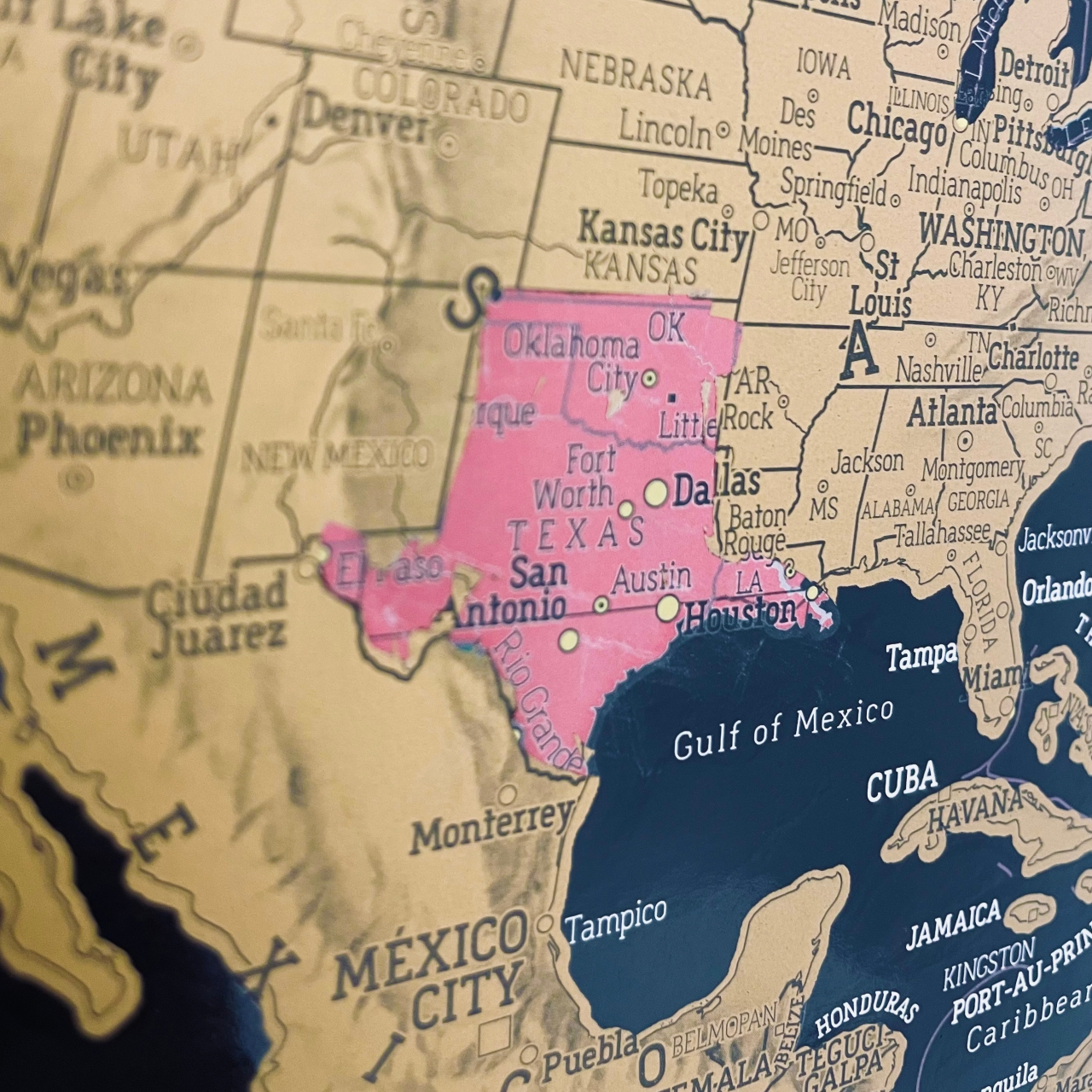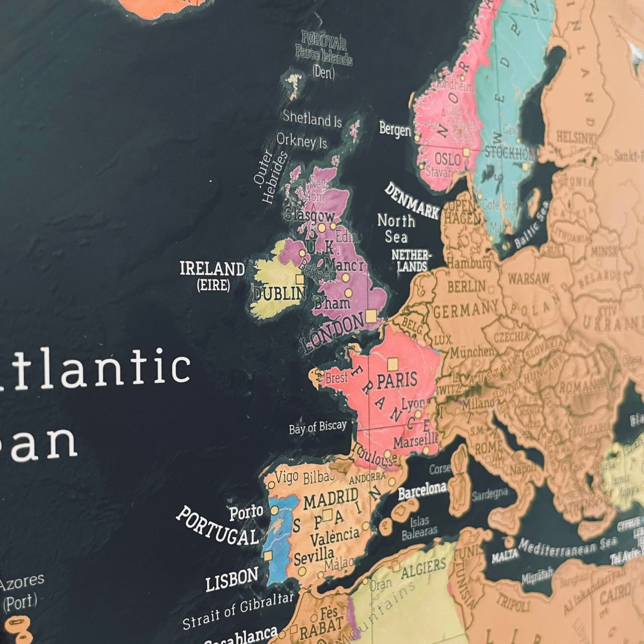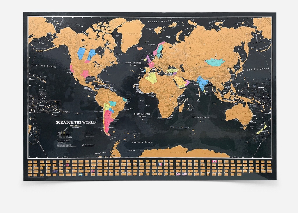 Neem een munt en kras alle bestemmingen die je bezocht hebt en creër je eigen gepersonaliseerde voortdurend veranderende wereldkaart. Niet alleen landen staan op de kaart, er zijn ook steden te zien op de bovenste laag en de wereldkaart eronder, wat voor meer gedetailleerd krassen zorgt.