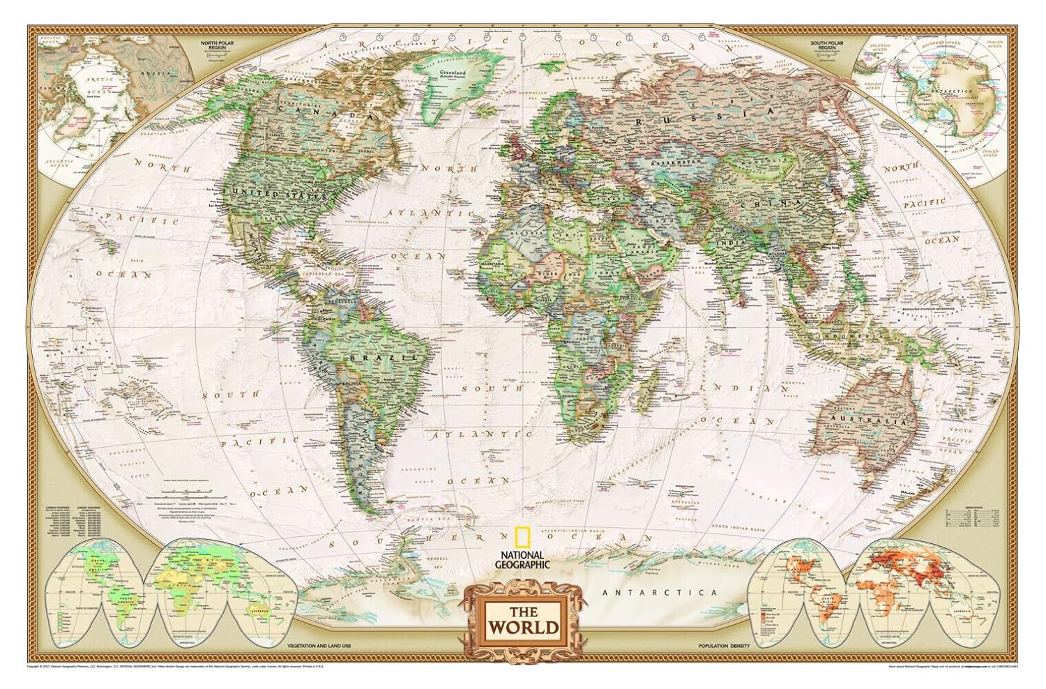 Wereld kaart (Engelstalig) van National Geographic in antieke stijl