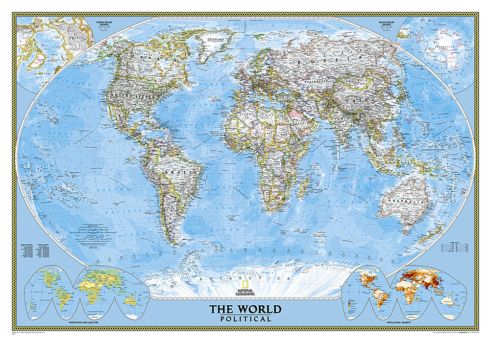 Een bijzondere grote wereldkaart van National Geographic. Deze kaart is politiek van opbouw: alle landen worden met duidelijke grenzen heel goed zichtbaar. Daarnaast staan er veel plaatsen op en worden ook de dieptes van de verschillende oceanen, golfstromen en heersende windrichtingen weergegeven.