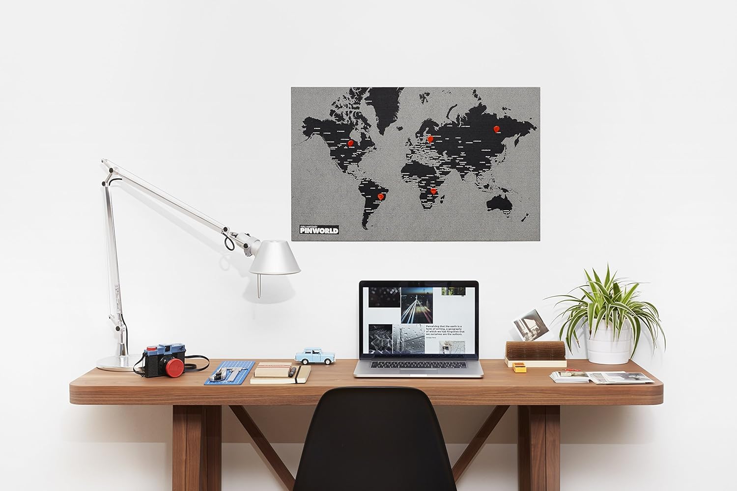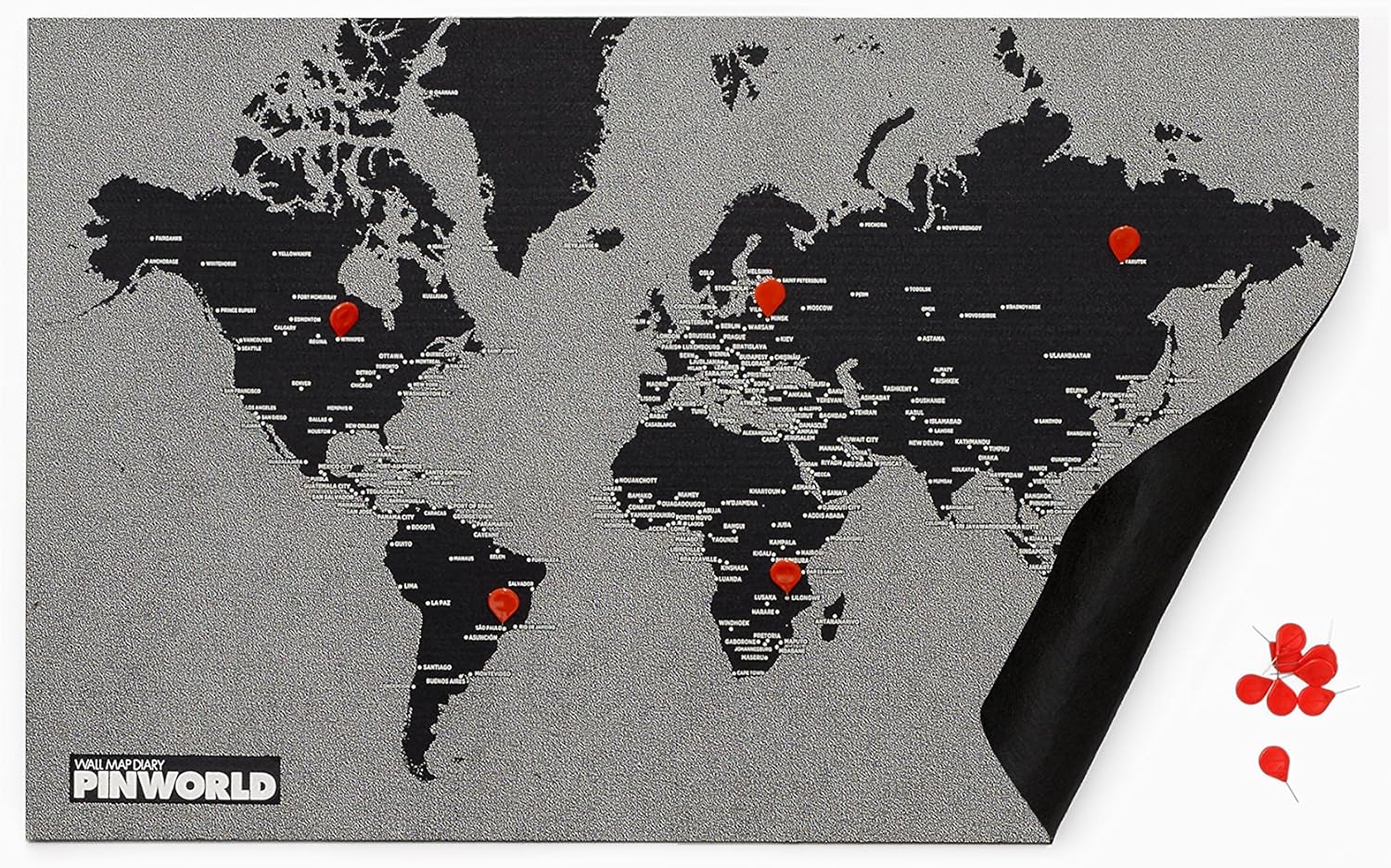 PinWorld is een wereldkaart geprint op een flexibele vilten ondergrond. De opvallende kleuren en het vilt vormen een hedendaags kunstwerk dat u volledig kan aanpassen naar uw wensen.In het pakket zijn 15 speciale pins inbegrepen om op de kaart te gebruiken. Pins, briefjes, tekeningen en foto's kunnen aangebracht worden aan de kaarten en zo kan men een persoonlijke dagboekmuur creëren.