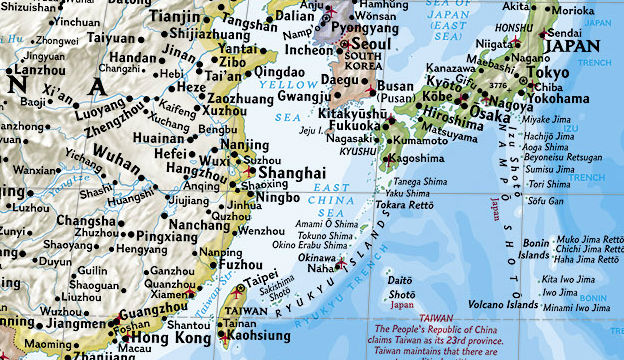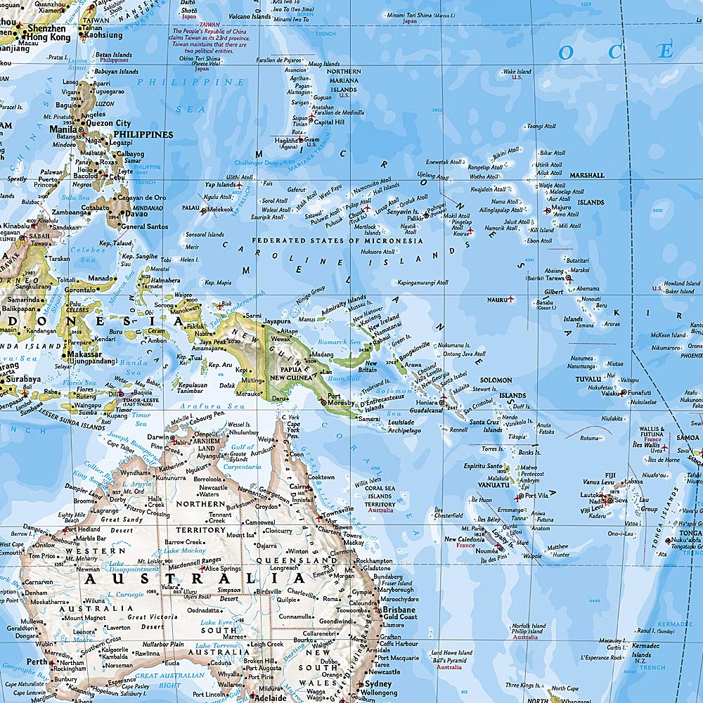 This unique view employs a new map projection to accentuate the Pacific Rim, and shows Oceania and Asia in close proportion to their actual size on the Earth. It brings Oceania and Asia into the center of the picture, while dramatically showing the entire breadth of the Pacific Ocean. The Pacific-centered world map features classic National Geographic cartography, with political boundaries, thousands of place names, time zones, and special insets showing world vegetation and land use, and population density.