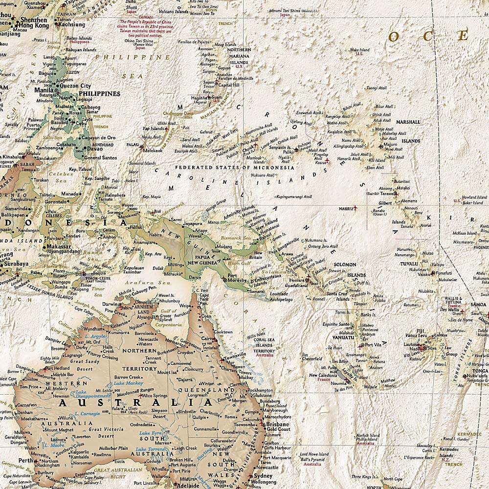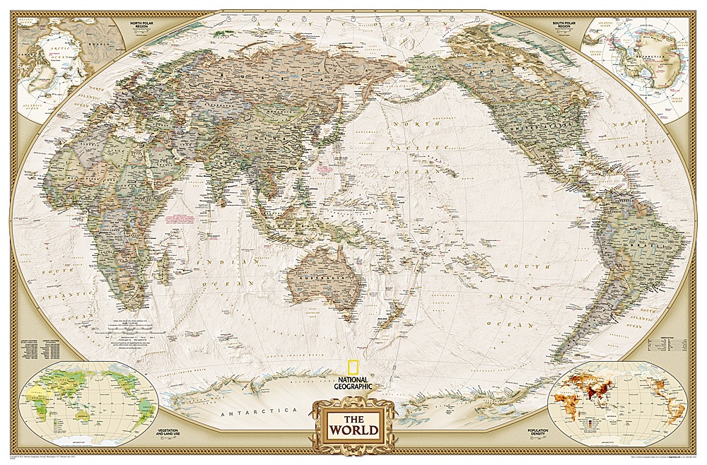 The Pacific-centered map employs a new map projection to accentuate the Pacific Rim, and shows Oceania and Asia in close proportion to their actual size on the Earth. It brings Oceania and Asia into the center of the picture, while dramatically showing the entire breadth of the Pacific Ocean. The Pacific-centered world map features classic National Geographic cartography, with political boundaries, thousands of place names, time zones, and special insets showing world vegetation and land use, and population density.