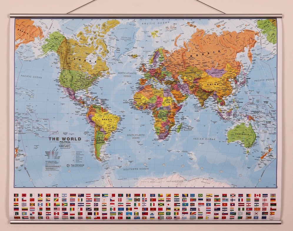 Wereldkaart World politiek met vlaggen geplastificeerd met latjes | 68 x 53 cm | Maps International (9781903030769)