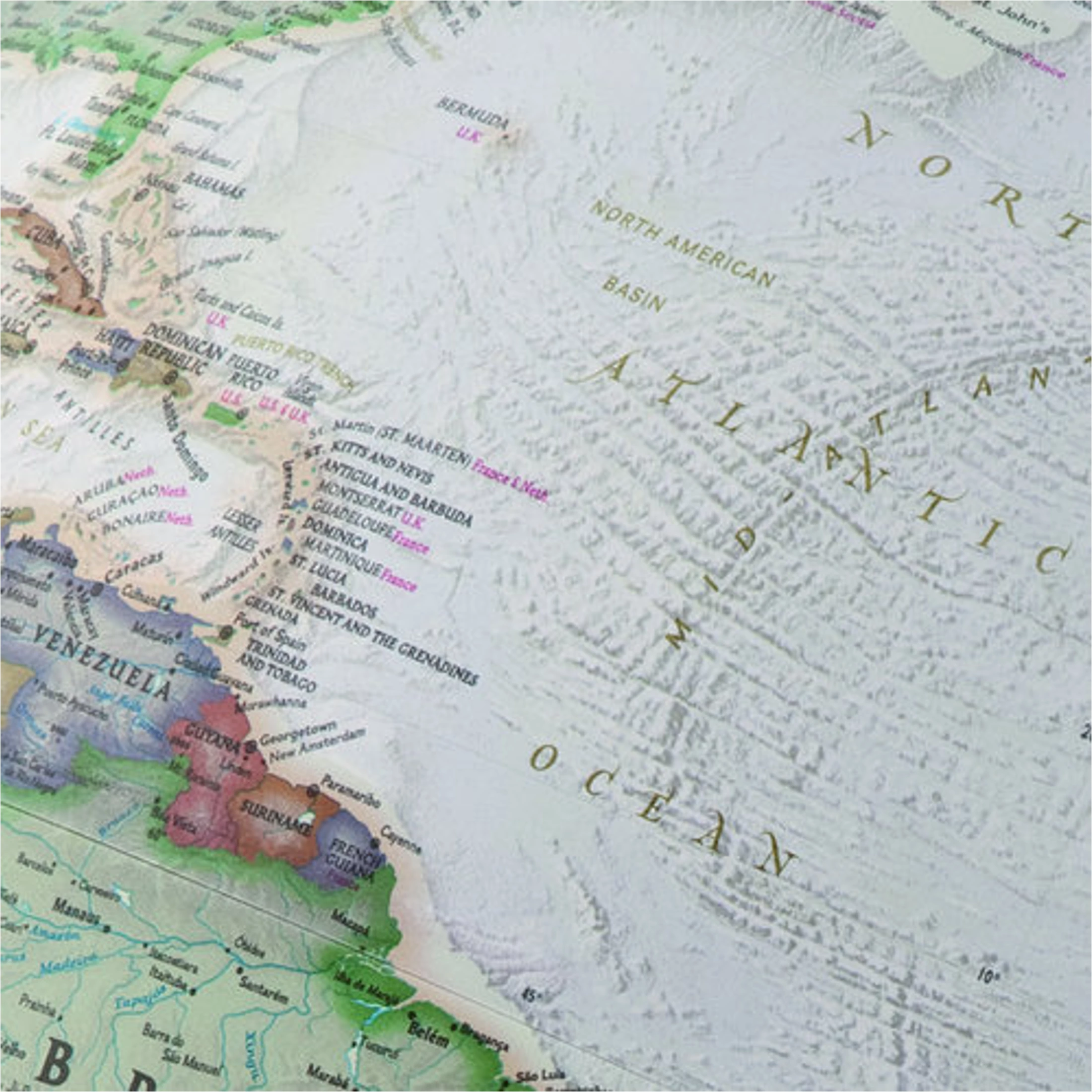 De National Geographic Gold wereldbol is verkrijgbaar in twee soorten: Classic met een helderblauwe oceaan en een voet van beukenhout en Executive (antiek) met een voet van walnoot.