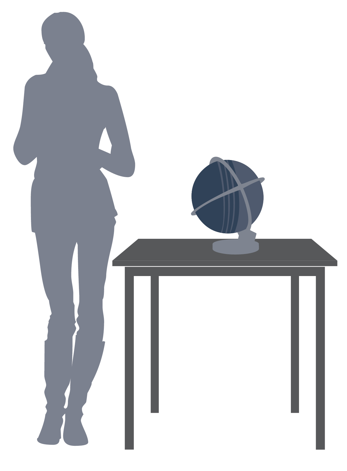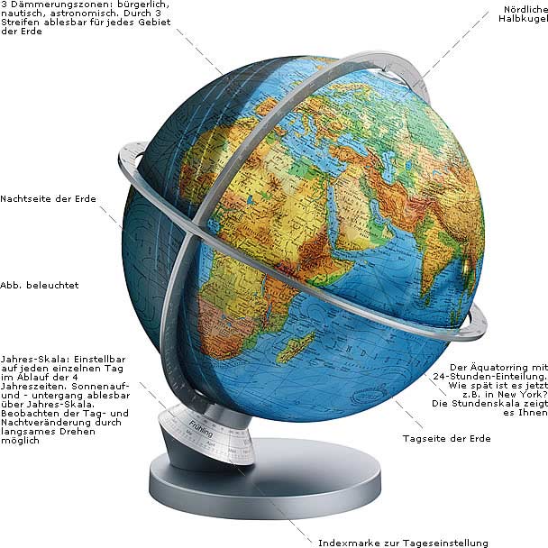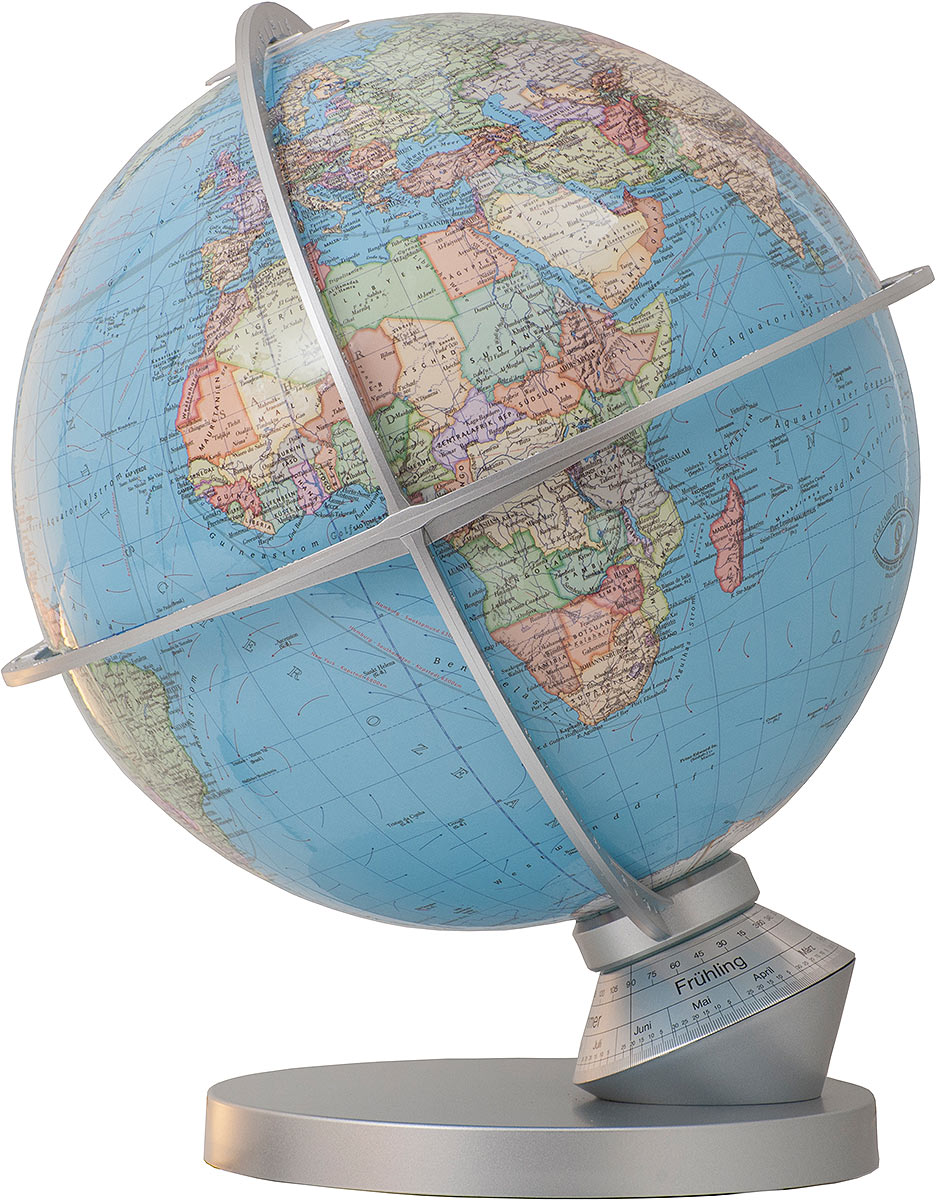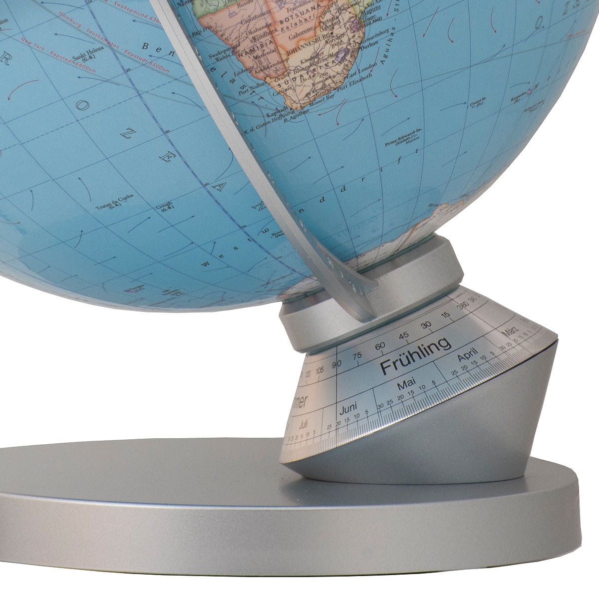 Diameter bol 30 cm, hoogte 42 cm, bol uit breukvast en warmtebestendig acryl. Breukvaste kunststof voet, in mat zilver. Twee hele meridianen, fiberglas in mat zilver, aan beide zijden gegradueerd. Electradraad geïntegreerd. Op het globevoetstuk zit een schaal waarmee elke dag van het jaar ingesteld kan worden. Bij het inschakelen van de globeverlichting wordt de globe in een verlichte en onverlichte helft verdeeld. Op deze wijze zal de verlichte helft als dagzijde en de onverlichte helft als nachtzijde herkenbaar zijn.