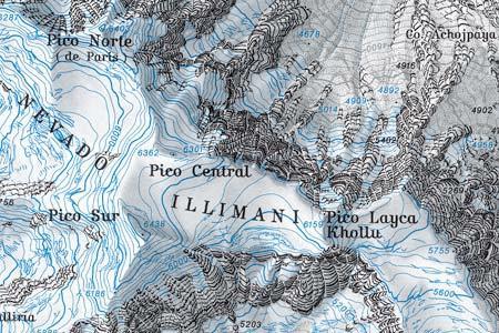 Trekking kaart van de Cordillera Real met als centrum de Illimani. Topografische kaart met hoogtelijnen en wandelroutes (klik op de kaart voor overzicht).