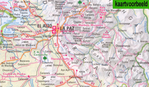 Goede wegenkaart van Bolivia en Paraguay. Aan beide kanten bedrukt. Met veel toeristische aanduidingen als nationale parken en culturele bezienswaardigheden. Prima leesbare kaart.