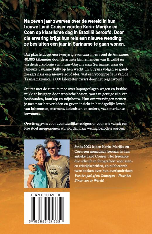 Na zeven jaar zwerven over de wereld in hun trouwe Land Cruiser worden Karin-Marijke en Coen op klaarlichte dag in Brazilië beroofd. Door die ervaring krijgt hun reis een nieuwe wending: ze besluiten een jaar in Suriname te gaan wonen. Dat plan leidt tot een tweejarig avontuur in en rond de Amazone: 40.000 kilometer door de armste binnenlanden van Brazilië en via de strafkolonie van Frans-Guyana naar Suriname, waar de fameuze Savanne Rally op hen wacht. In Guyana volgen ze goudzoekers naar een nieuwe goudader, wat een voorproefje is van de Transamazônica: 2.000 kilometer dwars door het regenwoud. Stuiter met de auteurs mee over kapotgeslagen wegen en krakkemikkige bruggen door tropische bossen, waar ze getuige zijn van bosbranden, houtkap en mijnbouw. Hun omzwervingen nemen je mee naar het verleden en geven inzicht in het dagelijks leven van inheemsen, marrons, kolonisten en andere, vaak markante bewoners. Over Bruggen is voor avontuurlijke reizigers of voor wie vanuit een luie stoel meegenomen wil worden naar weinig bezochte oorden.Reviews