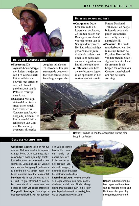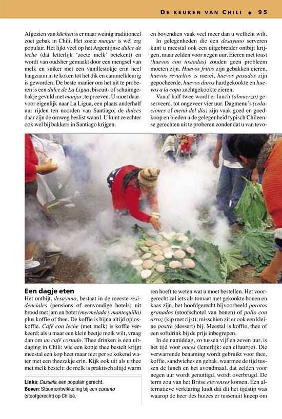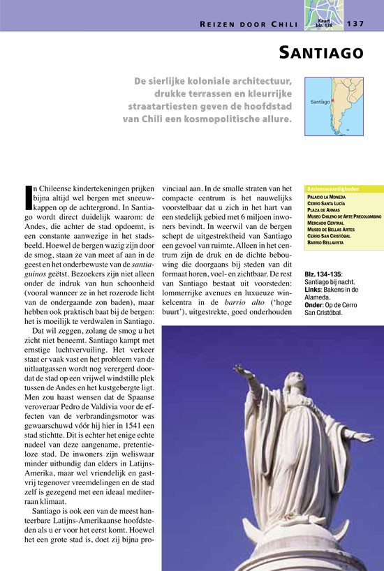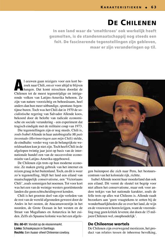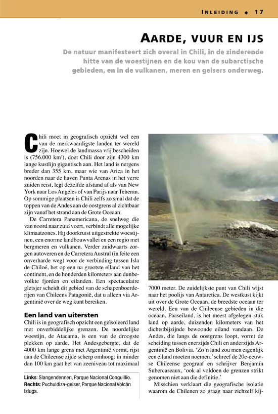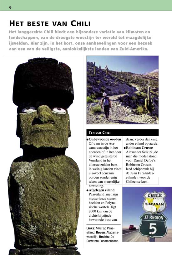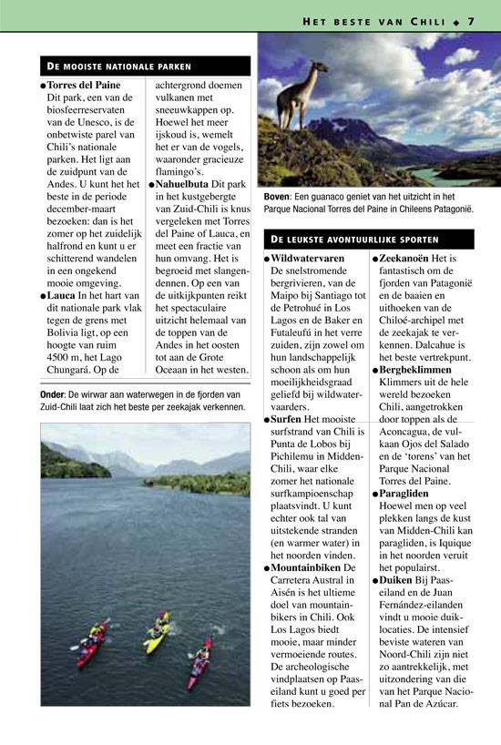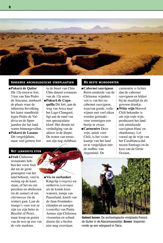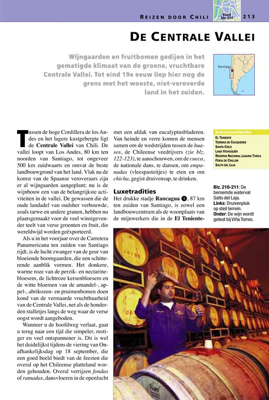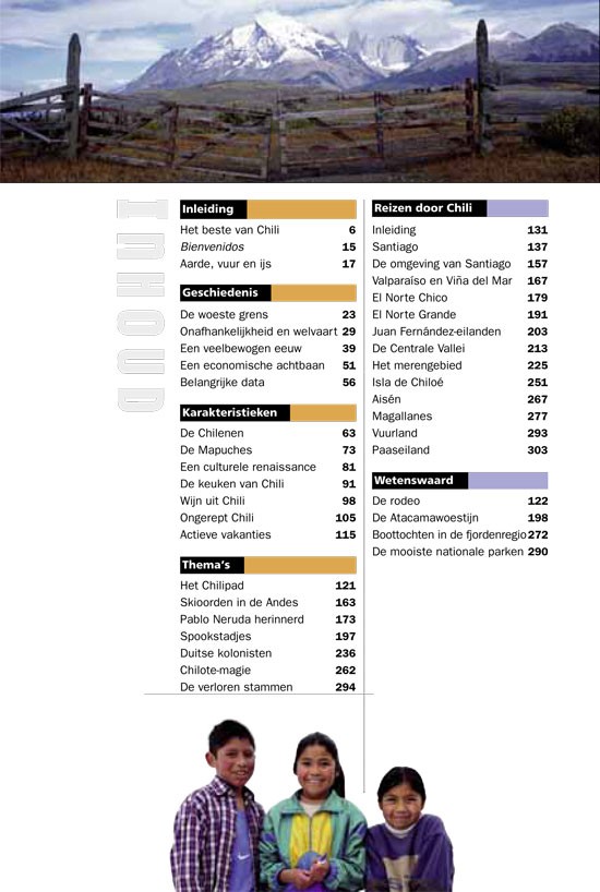 Deze hoofdstukken worden afgewisseld met speciale themapagina's over onder andere 'Chilote-magie', 'rodeo', 'De verloren stammen', 'Spookstadjes' en 'De Atacamawoestijn'. De gedetailleerde kaarten en prachtige kleurenfoto’s maken deze gids compleet.