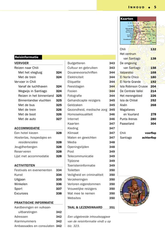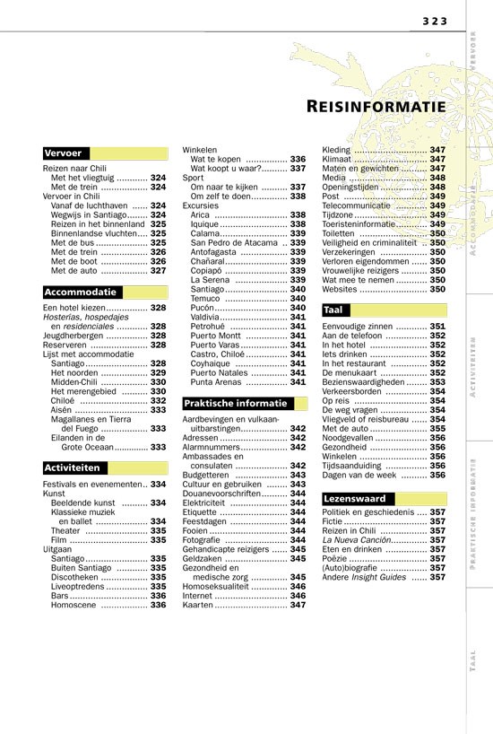 In het gedeelte 'Reisinformatie' vindt u alles over vervoer, accommodatie, restaurants, reisbenodigdheden, noodgevallen, gezondheid, toeristische tips, uitgaan, klimaat, winkelen, nuttige adressen en talloze andere wetenswaardigheden. Insight Guide Chili s hierdoor niet alleen een bron van informatie en inspiratie, maar ook een bijzonder praktische reisgids.