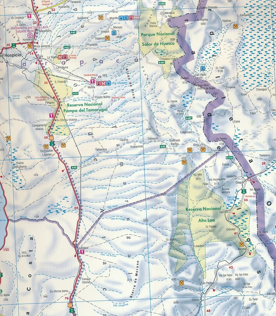 Gedetailleerde, tweezijdige landkaart van Chili, prima geschikt voor planning en rondtrekken door het land. De berijdbare wegen zijn goed weergeven, zowel de hoofdwegen als provinciale en lokale wegen; wegnummers worden vermeld. Afstanden tussen plaatsen zijn in kilometers op de kaart ingetekend, daarnaast worden ook op belangrijke plekken benzinepompen gemarkeerd.