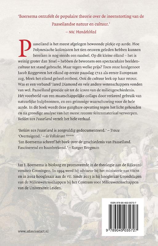 Jan Boersema doet in Beelden van Paaseiland alles uit de doeken over het meest afgelegen bewoonde plekje op aarde: Paaseiland. Hoe Polynesische kolonisten het tien eeuwen geleden hebben kunnen bereiken is nog steeds een raadsel. Op dit kleine eiland – het is weinig groter dan Texel – hebben de bewoners een spectaculaire beeldencultuur tot stand gebracht. Maar tegen welke prijs? Toen onze landgenoot Jacob Roggeveen het eiland op eerste paasdag 1722 als eerste Europeaan zag, bleek het eiland geheel ontbost. Ook de cultuur leek op haar retour. Was er een verband? Jared Diamond en vele andere wetenschappers vonden van wel. Paaseiland groeide uit tot de icoon van de milieugeschiedenis. Hét voorbeeld van een maatschappelijke collaps door verkeerd gebruik van natuurlijke hulpbronnen, en een grimmige waarschuwing voor de hele aarde. In dit boek wordt deze gangbare opvatting tegen het licht gehouden en na grondige analyse van het meest recente feitenmateriaal verworpen.