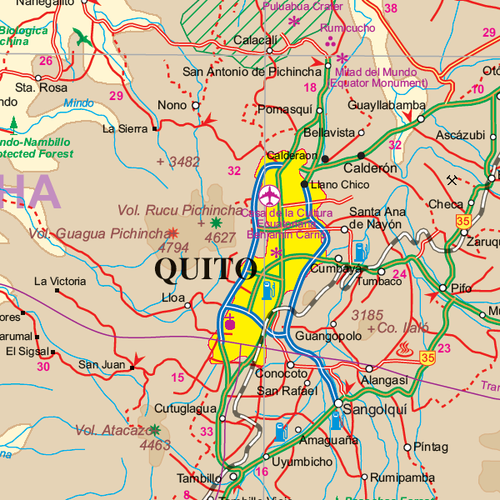 Duidelijke wegenkaart van Ecuador, aan 2 zijden bedrukt. Met stadsplattegronden van Quito, Guayaquil. Aanduidingen van benzinestations, Nationale parken en bezienswaardigheden.