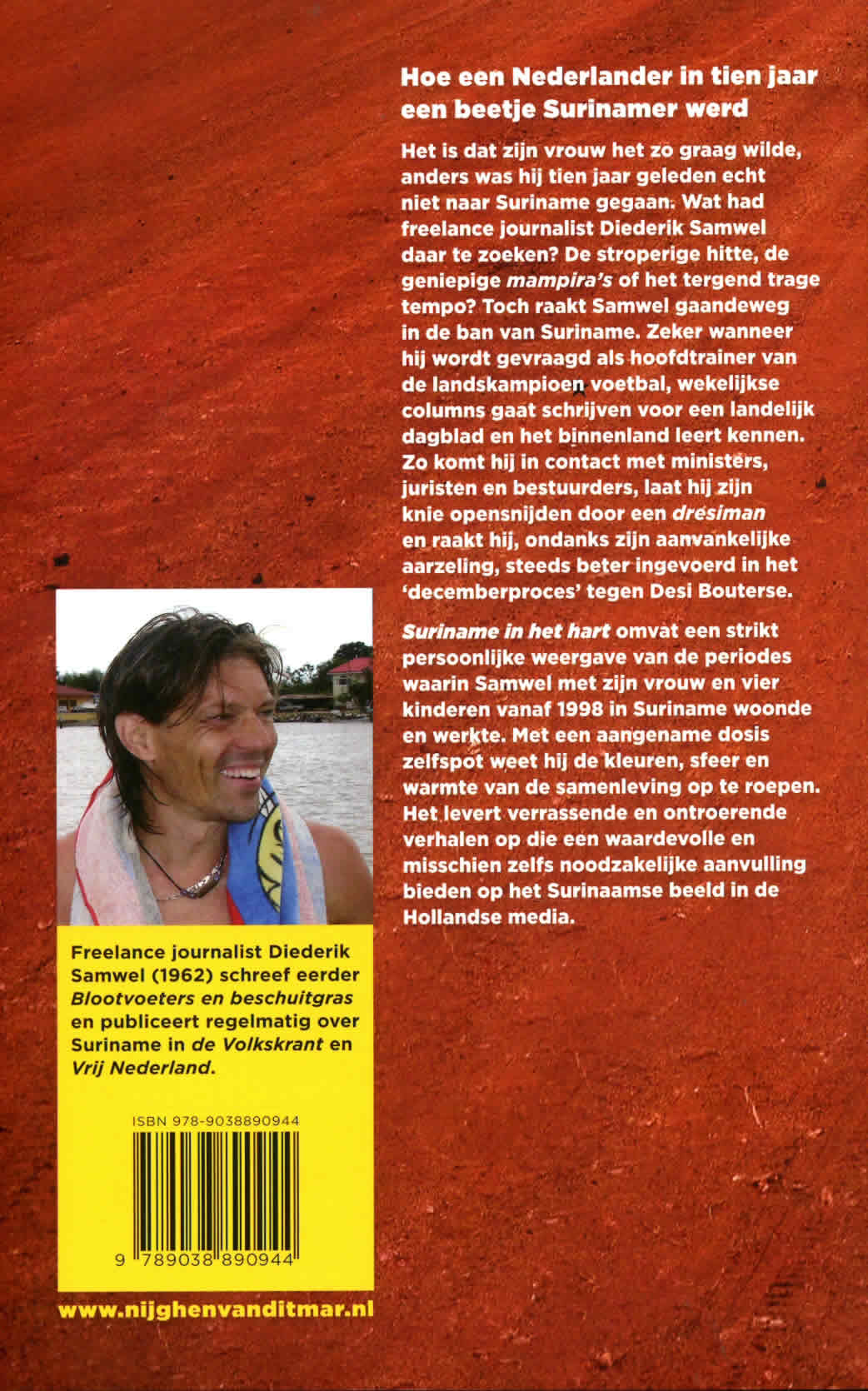 Het is dat zijn vrouw het zo graag wilde, anders was hij tien jaar geleden echtniet naar Suriname gegaan. Wat had freelance journalist Diederik Sam wel daar te zoeken? De stroperige hitte, de geniepige mampira’s of het tergend trage tempo? Toch raakt Sam wel gaandeweg in de ban van Suriname. Zeker wanneer hij wordt gevraagd als hoofdtrainer van de landskampioen voetbal, wekelijkse columns gaat schrijven voor een landelijk dagblad en het binnenland leert kennen.Zo komt hij in contact met ministers, juristen en bestuurders, laat hij zijn knie opensnijden door een dresi man en raakt hij, ondanks zijn aanvankelijke aarzeling,steeds beter ingevoerd in het ‘decemberproces’ tegen Desi Bouterse.Suriname in het hart omvat een strikt persoonlijke weergave van de periodes waarin Sam wel met zijn vrouw en vier kinderen vanaf 1998 in Suriname woont en werkte. Met een aangename dosis zelfspot weet hij de kleuren, sfeer en warmte van de samenleving op te roepen. Het levert verrassende en ontroerende verhalen op die een waardevolle en misschien zelfs noodzakelijke aanvulling bieden op het Surinaamse beeld in de Hollandse media.