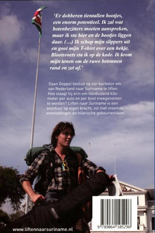 In Liften naar Suriname beschrijft Daan Goppel (24) hoe hij per auto en boot van Nederland naar Suriname liftte. Een verrassend debuut over een avontuur op eigen kracht, vol vreemde ontmoetingen en hilarische gebeurtenissen. 'Dan is daar de zee. Een blauwe baai wordt half omsloten door een oud stadje. Over de boulevard struinen nietsvermoedende toeristen en in het water dobberen zeilboten; ze liggen vredig voor anker en draaien mee met de wind. Er wapperen verschillende vlaggen, Franse, Zweedse, Finse, en hier en daar ligt een rubberbootje langszij, een teken dat er mensen aan boord zijn. Een van die boten kan mij toch wel meenemen? Ik wil het gaan vragen. Maar die boten liggen daar. Ik sta hier. Ik schop mijn slippers uit, werp mijn T-shirt over een hek, loop naar de kaderand en duik.'