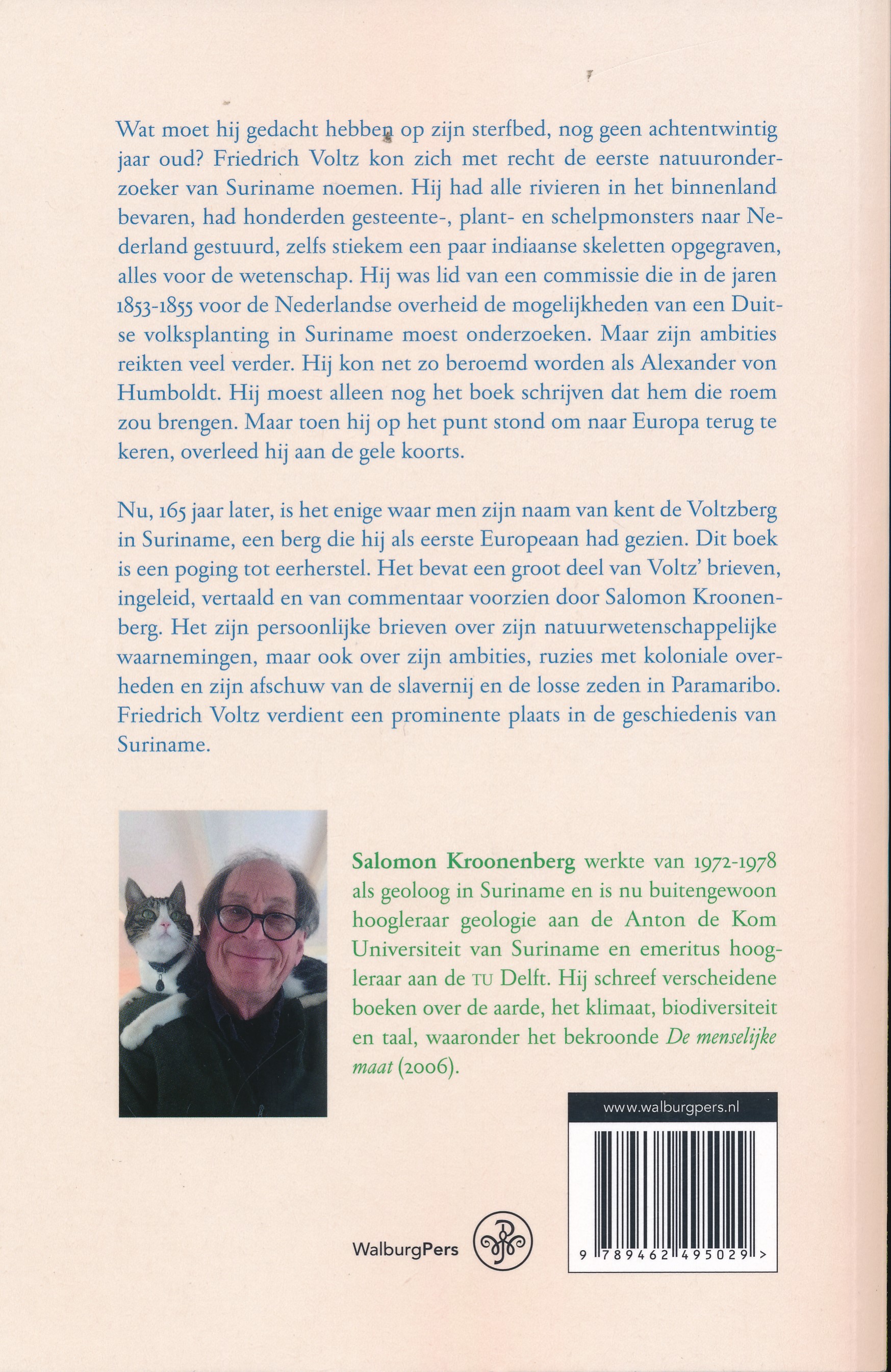 Het enige dat nog ontbrak was het schrijven van het boek dat hem die roem zou brengen. Hij stond op het punt naar Europa terug te keren om die taak te volbrengen, toen de gele koorts hem in zijn greep kreeg. Op 6 augustus 1855 overleed hij in Paramaribo.00Nu, bijna 170 jaar later, is het enige waar men in Suriname zijn naam van kent de Voltzberg, een berg die hij als eerste Europeaan had gezien, en die pas veel later, ver na zijn dood, naar hem vernoemd werd. Dit boek is een poging tot eerherstel. Het bevat een groot deel van zijn brieven, uit het Duits vertaald en van commentaar voorzien door Salomon Kroonenberg. Het zijn persoonlijke brieven, die zich niet alleen beperken tot natuurwetenschappelijke waarnemingen, maar ook een helder beeld geven van zijn ambities, zijn frustraties, zijn ruzies met koloniale overheden en met zijn reisgenoten, zijn afschuw van de slavernij en de losse zeden in Paramaribo, zijn hoop en zijn triomfen. Hij verdient een prominente plaats in de geschiedenis van het Surinaamse natuuronderzoek.