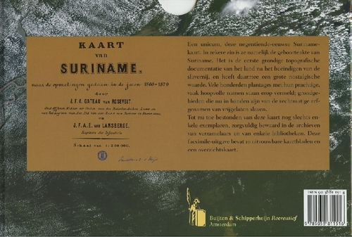 Een unicum, deze negentiende-eeuwse Surinamekaart. In zekere zin is ze namelijk de geboorte akte van Suriname. Het is de eerste grondige topografische documentatie van het land na het beëindigen van de slavernij, en heeft daarmee een grote nostalgische waarde. Vele honderden plantages met hun prachtige vaak hoopvolle namen staan erop vermeld; grondgebieden die nu in handen zijn van de rechtmatige erfgenamen van vrijgelaten slaven. Tot nu toe bestonden van deze kaart nog slechts enkele exemplaren, zorgvuldig bewaard in de archieven van verzamelaars en van enkele bibliotheken. Deze facsimile-uitgave bevat 10 uitbvouwbare kaartbladen en een overzichtskaart.